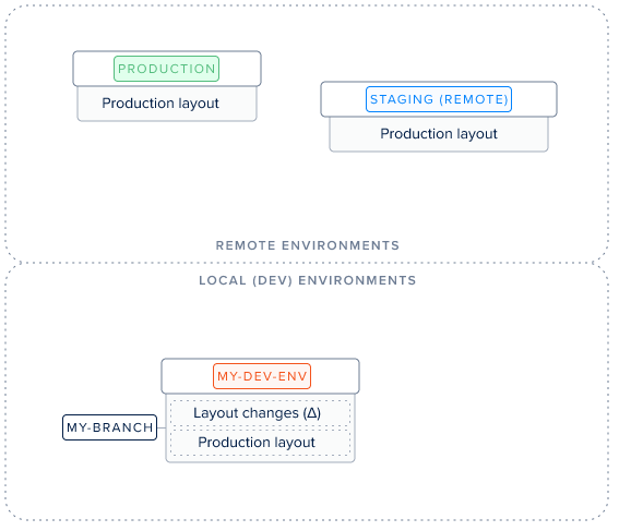 Imagine you have pushed a Branch layout changes onto a Remote Environment, but notice a slight change is still required in the layout. You can apply the final touches using the Layout Editor from the Remote Environment. It will be applied on top of your Branch layout changes; any changes you make on that Remote Environment will also be deployed when you decide to run forest deploy.