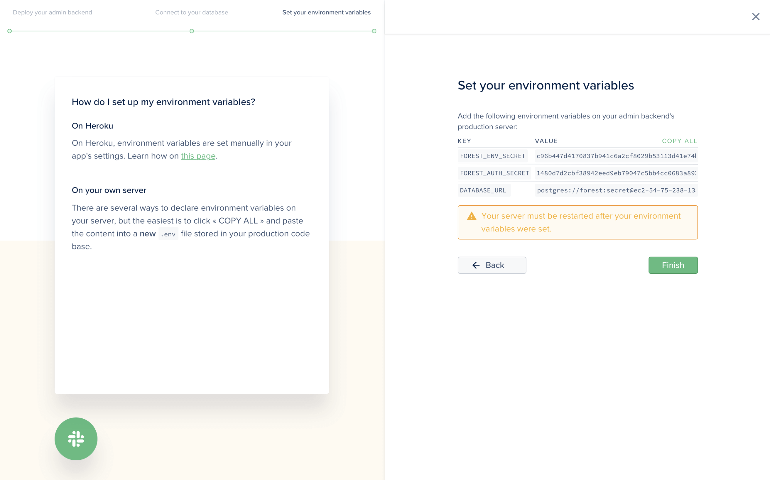 The final step requires that you add environment variables to your server. Follow the on-screen instructions:
