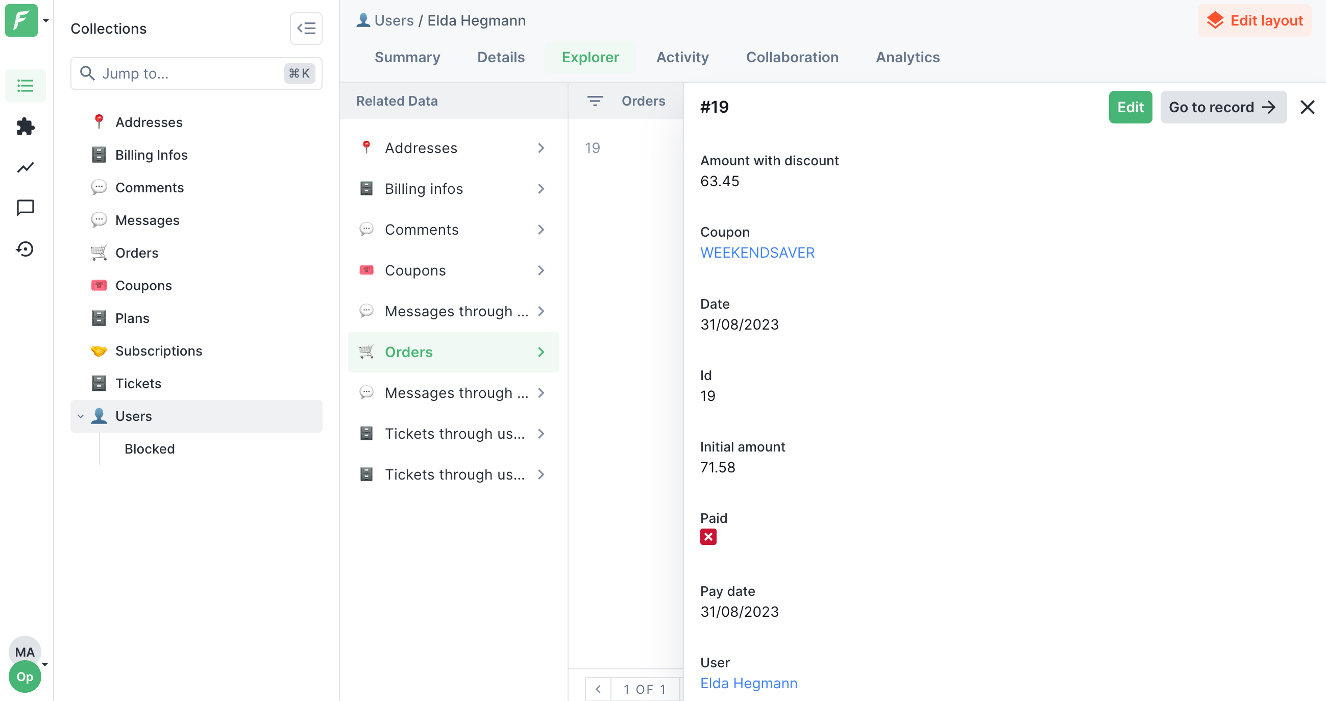 The Explorer view allows you to quickly preview relationships between your data, even when they are multiple levels deep. For example, you can quickly access orders placed by a specific user. The view is available out-of-the-box, but you need to customize it.&#x20;
