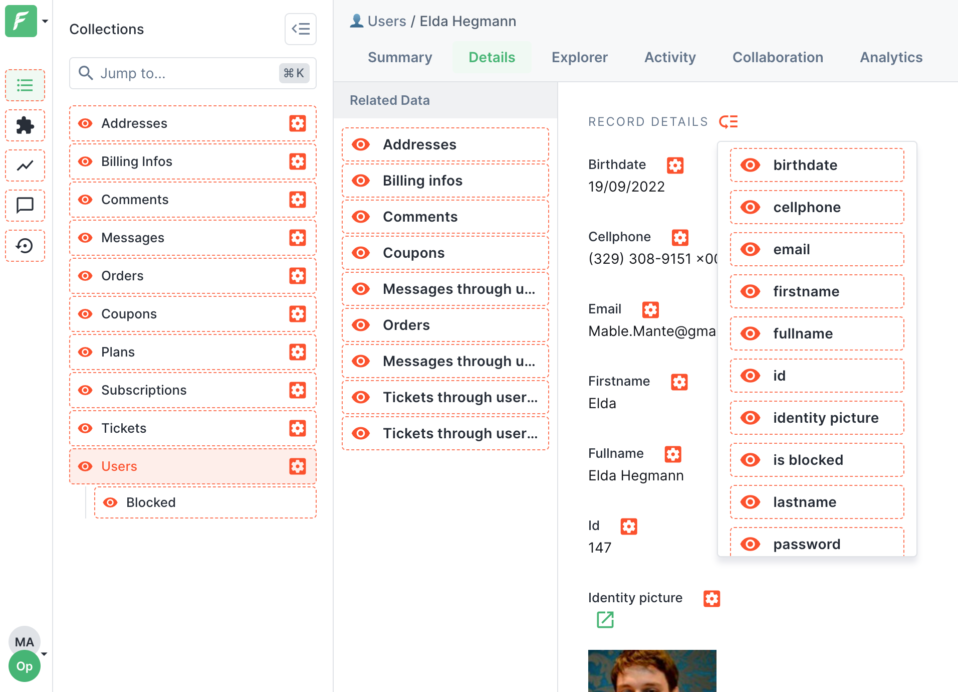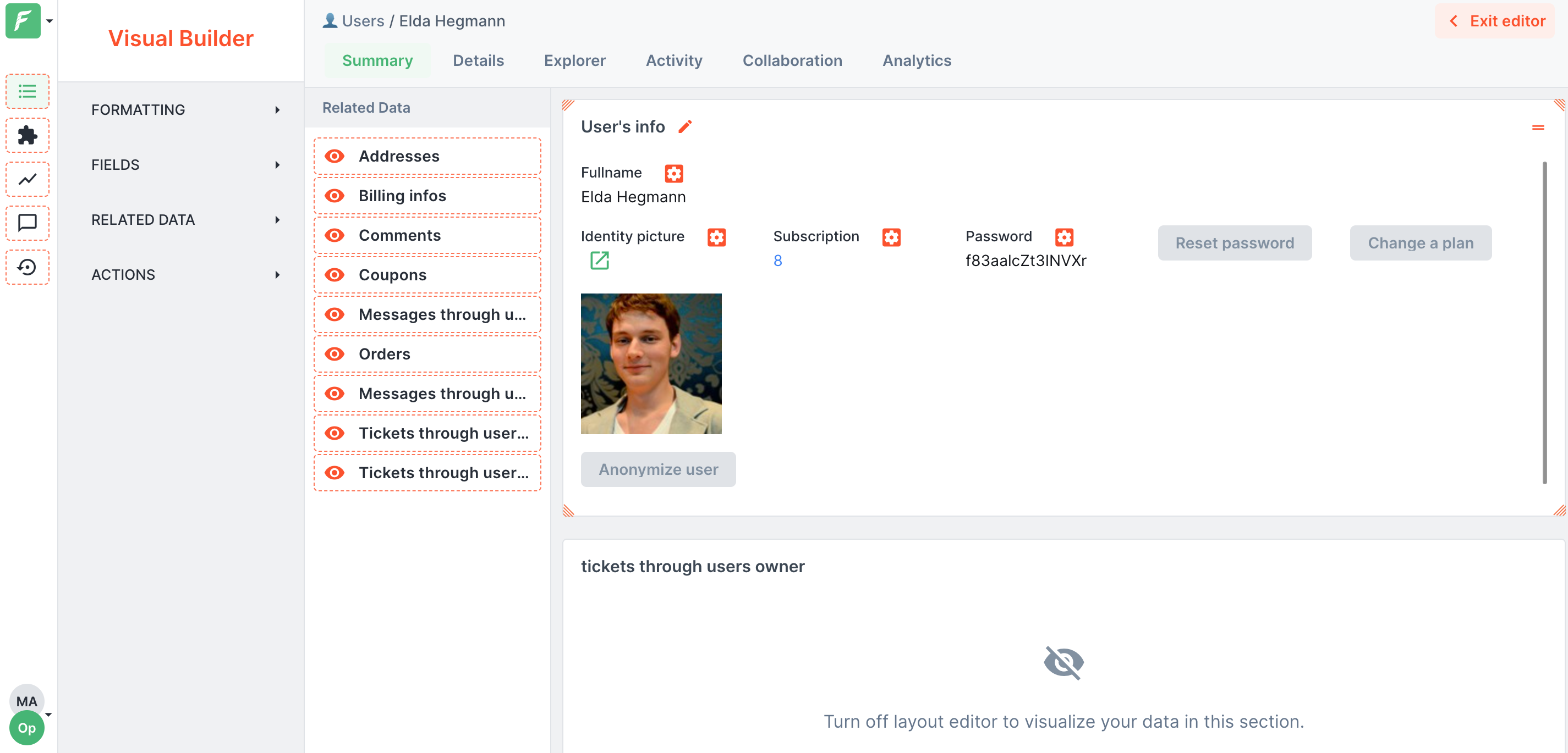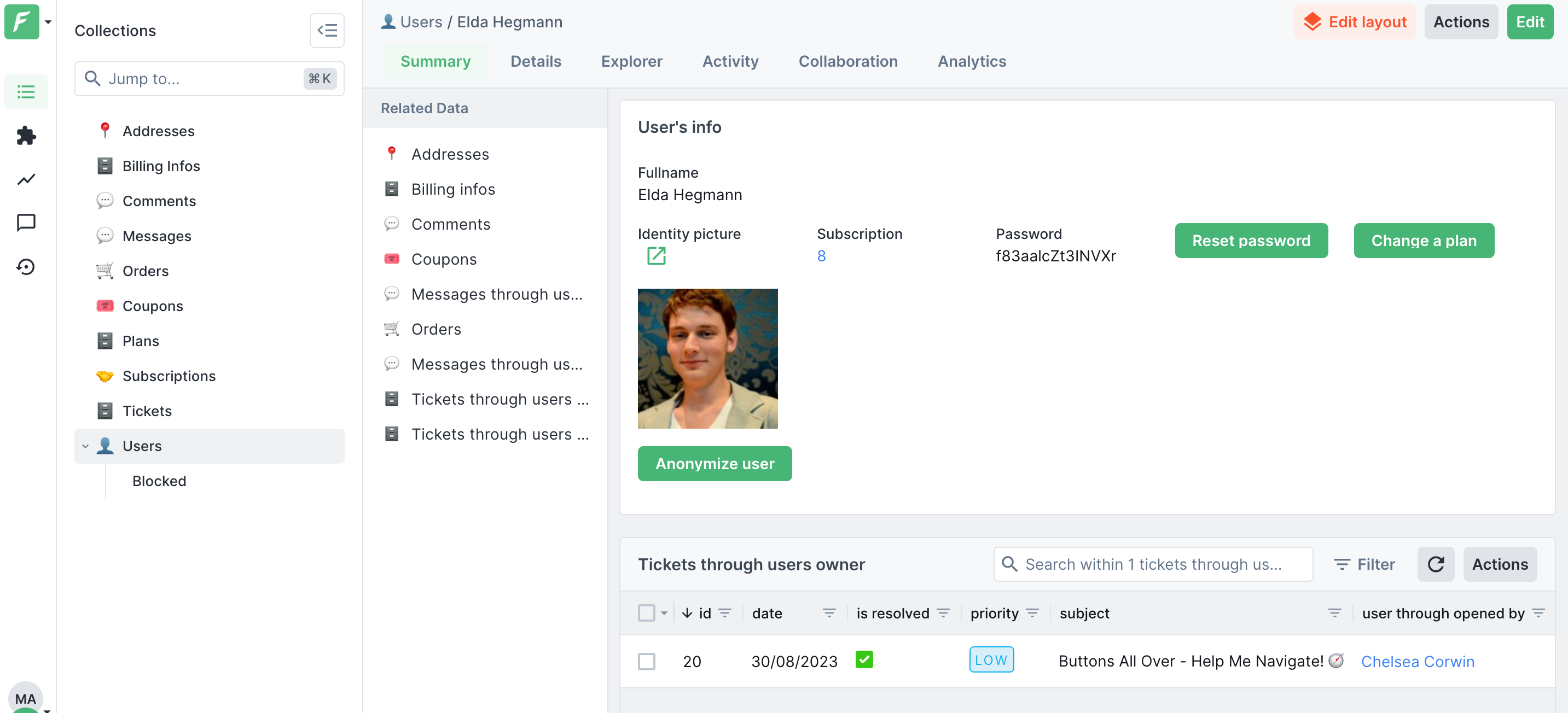 A Summary View allows you to quickly gather the most important information about each record, e.g. a user and available actions. They are customizable with a no-code drag-and-drop visual editor. In this example, we built a basic view that allows you to preview the user's data, reset a password, change a plan, and anonymize this user. Go to the next section of the guide ([*Adding Customer Support-specific features*](https://docs.forestadmin.com/tutorials/customer-support-tool/adding-customer-support-specific-features)) to learn how to create such action buttons.&#x20;