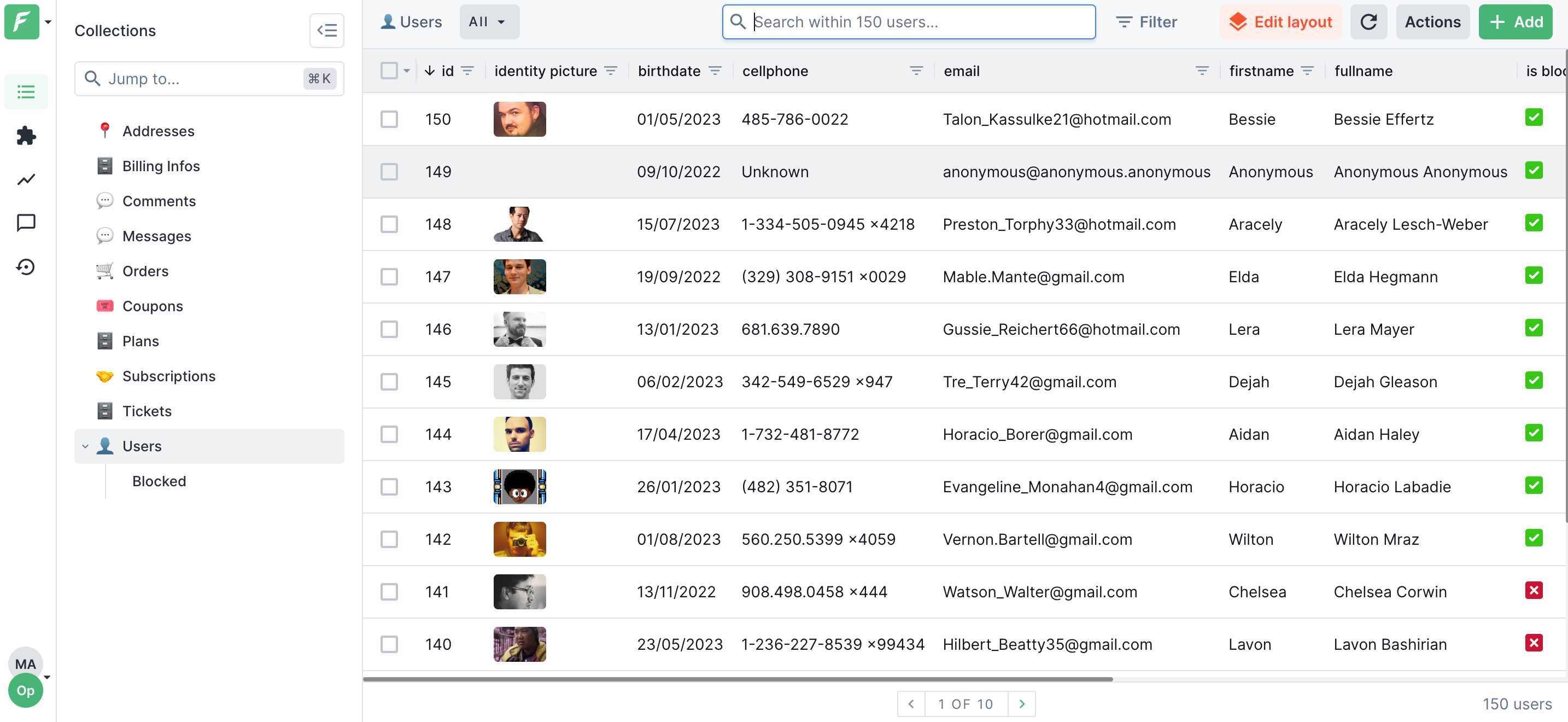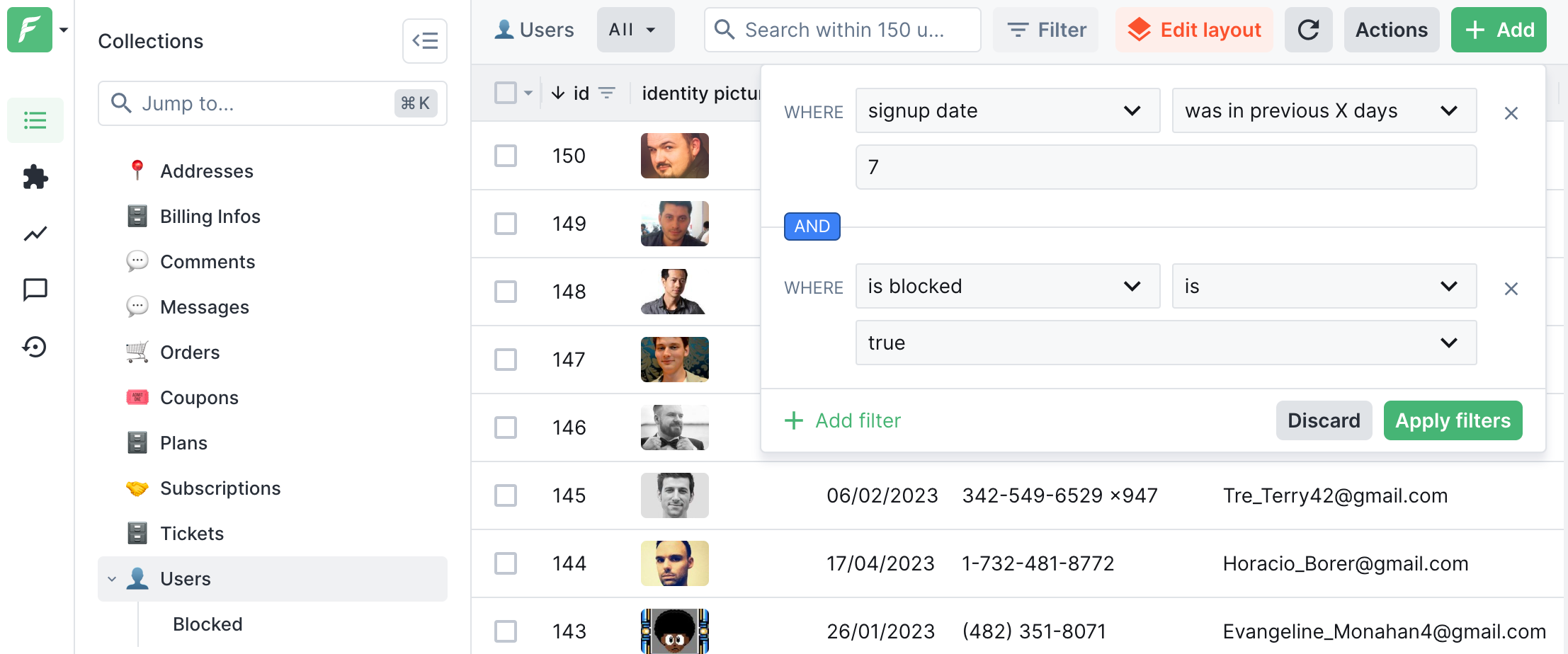 To access user data for customer support, use the admin panel as the single source of truth. After creating a project and connecting a data source, you will be able to see a table view, with all the collections, and the ability to add, edit, and delete user data.