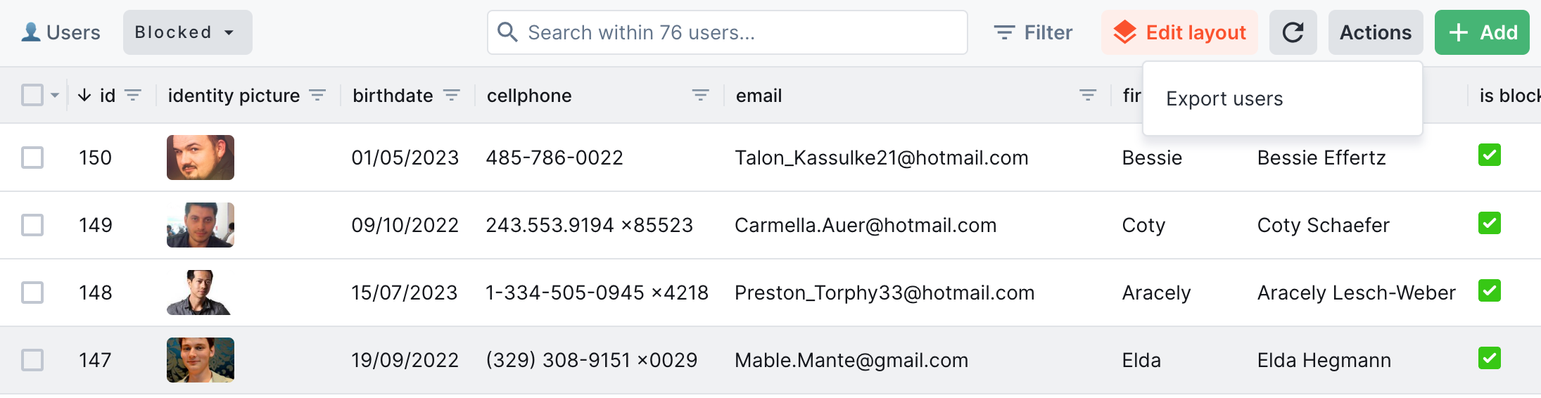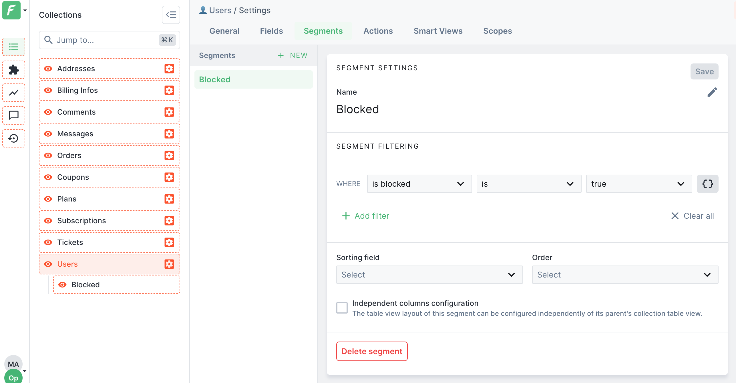 If you need to apply a specific set of filters on a regular basis, it's a good idea to save it as a segment. We created one to display only blocked users. To create a Segment, activate a layout editor, click on the cog just next to the collection you want to edit, and select the Segments tab.&#x20;