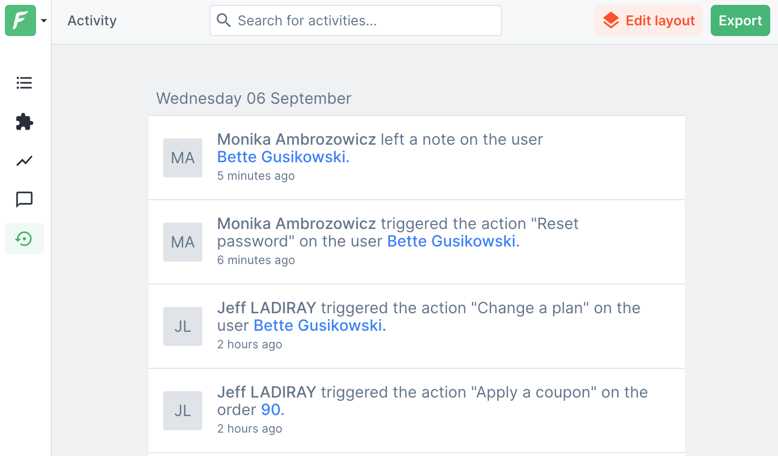 You can follow the trail of modifications on any customer's record to stay on top of everything related to specific customers.