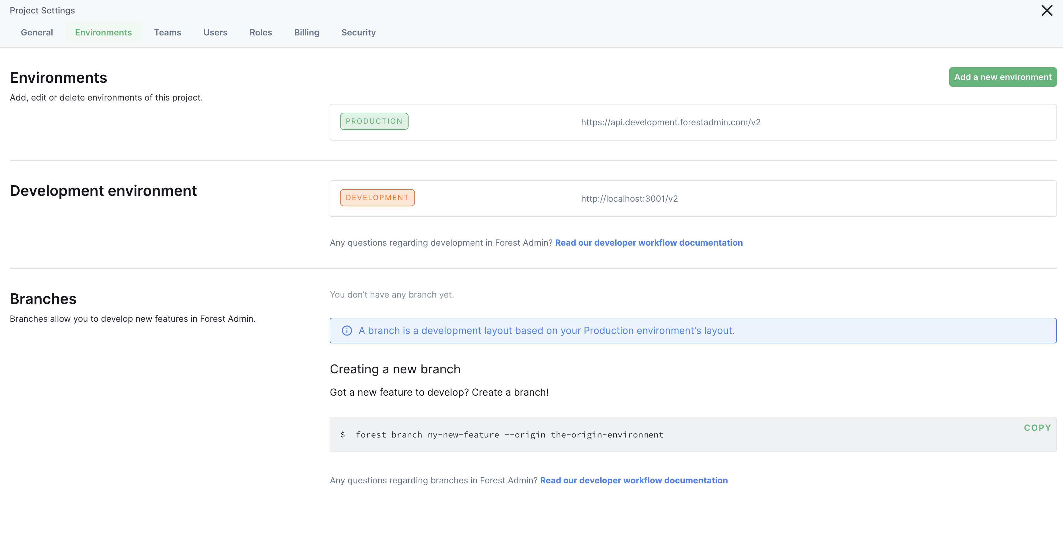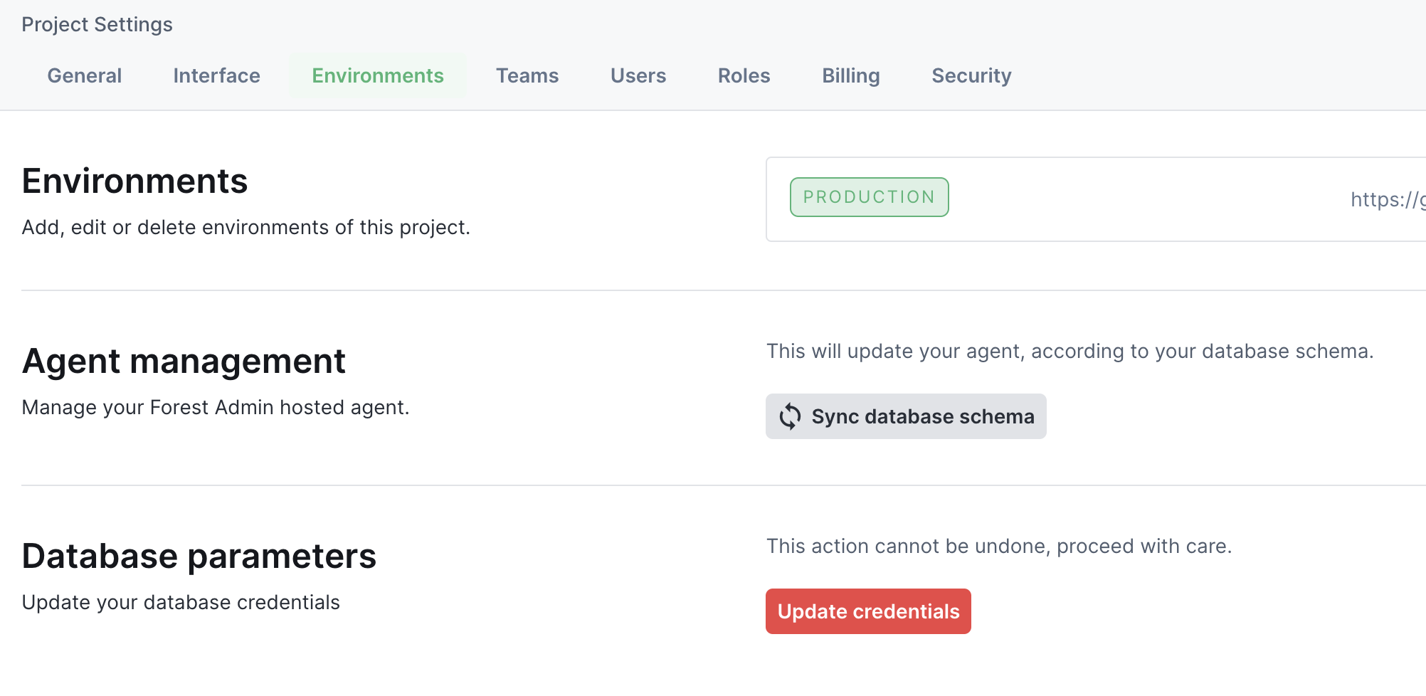 Environments allow developers to manage [development workflow](https://docs.forestadmin.com/developer-guide-agents-nodejs/deploying-to-production/using-branches). In cloud version, this tab allow admins and developers to synchronize the agent with the database and to update database credentials.