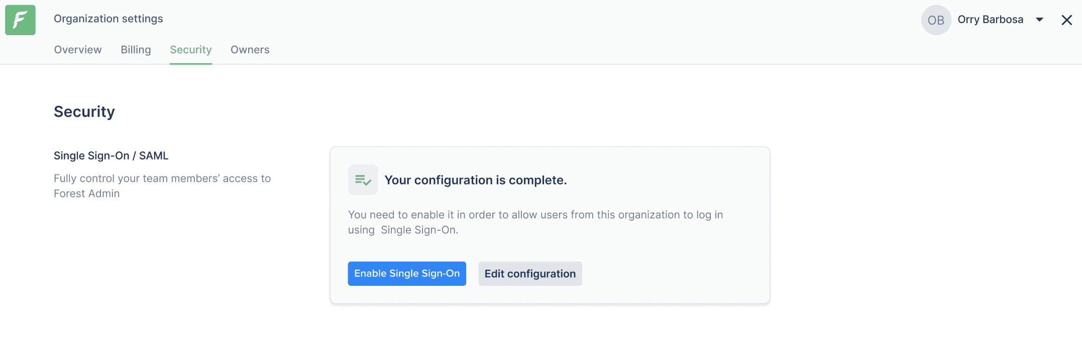 This tab gathers all security options of your Organization. For now you can only configure Single Sign-On (SSO).