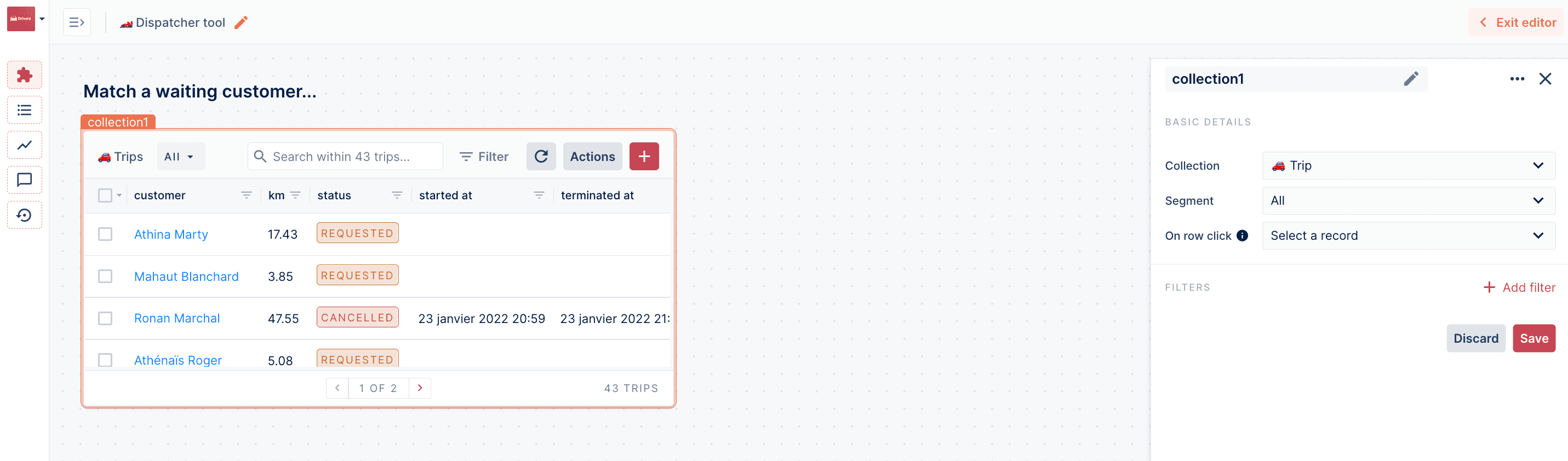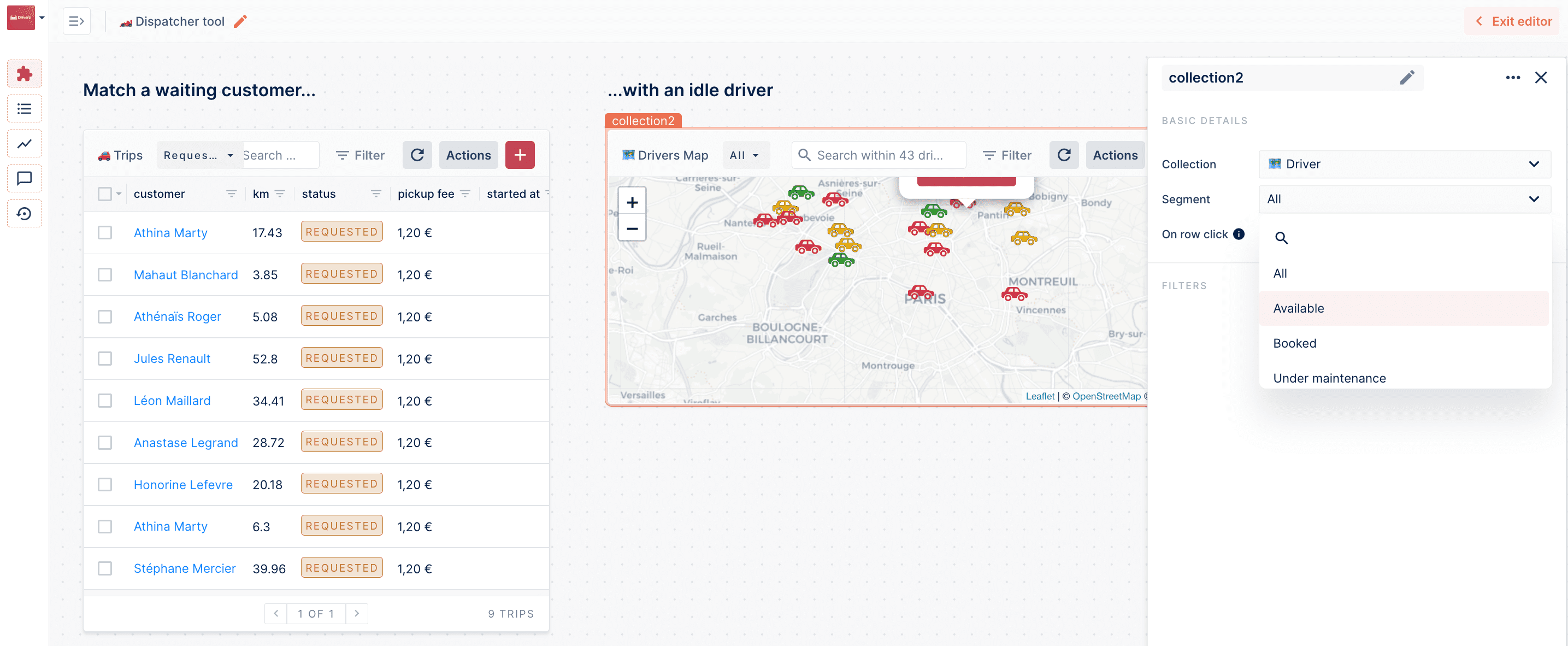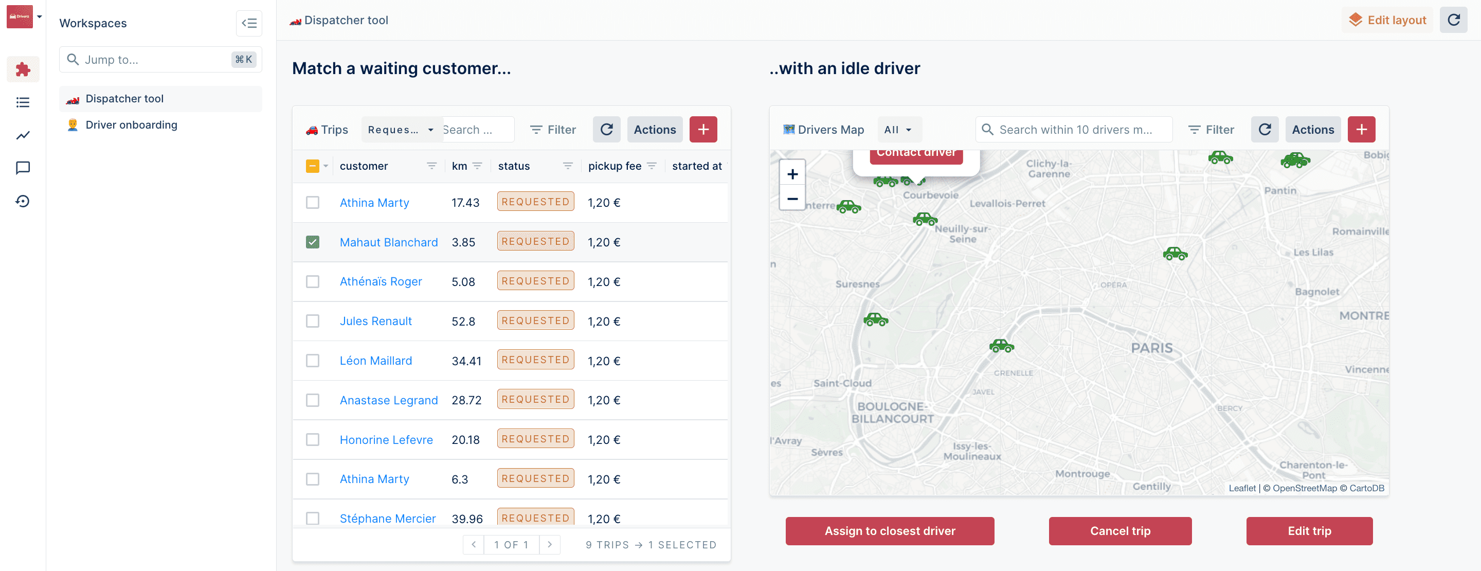 In this guide, we will walk you through the creation of a workspace for the Fleet management use case. Imagine you are an Uber-like company: you manage a fleet of vehicules and must transport customers wherever they ask as fast as possible. The goal of this Workspace is to make this easy to operate from a single screen.