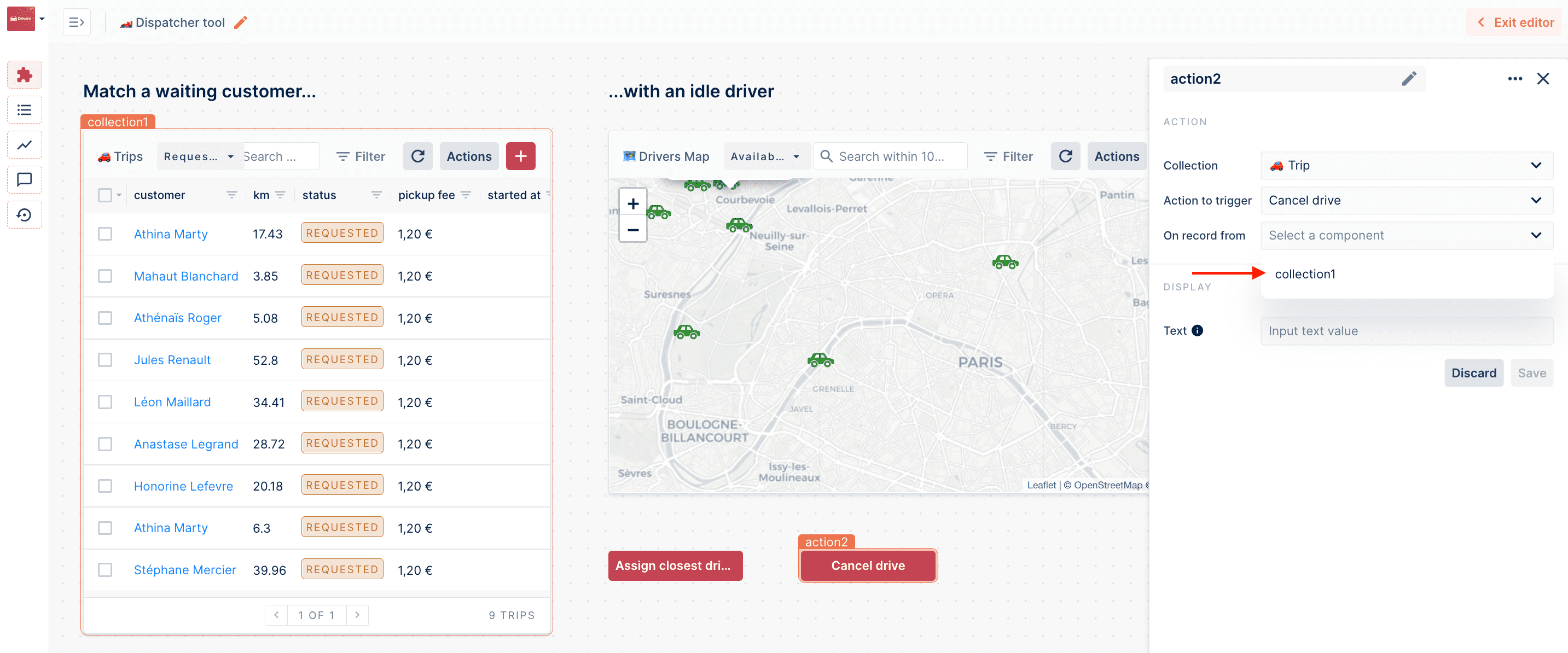 Lastly, let's add actions. In an Action component, if a record must be selected to execute the action on, you'll have to indicate in the "On record from" field what component will be used to select the record. In our case, it will be collection1.