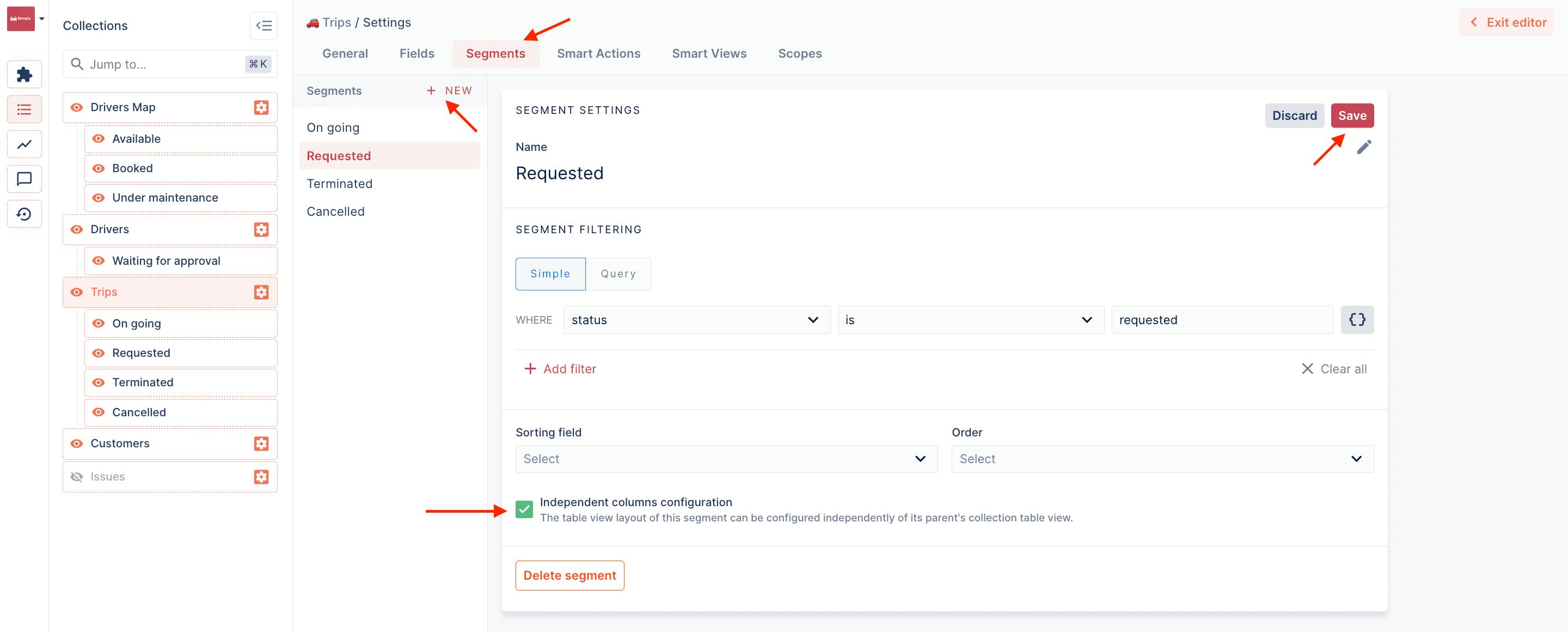 To adjust the columns you want to display and in which order, click the top left icon from the segment view while in Layout Editor mode: